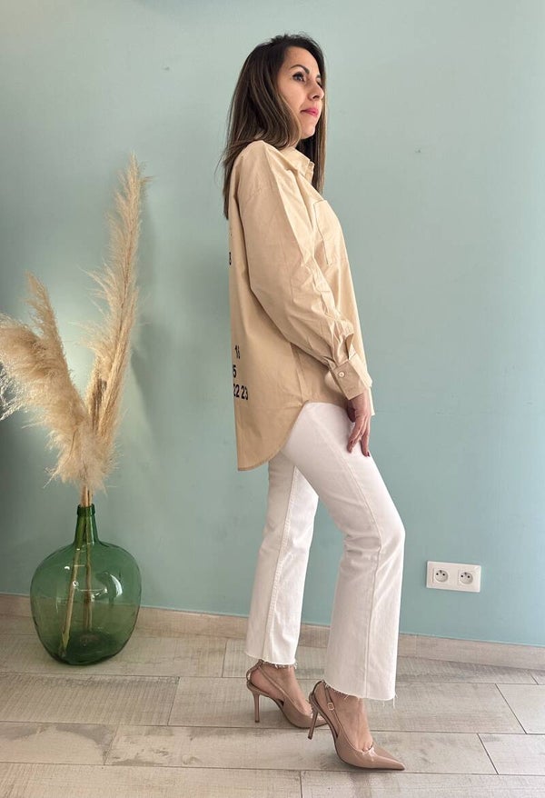 Chemise beige manches longues décontractées, longue derrière, avec imprimés écritures Paris et numéros en noir