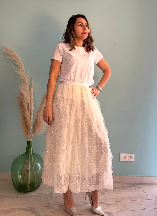 Jupe LENA blanche longue élégante en tulle à paillettes