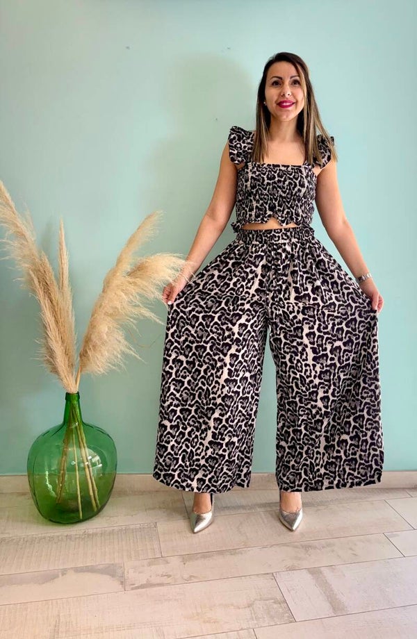 Ensembles MARGOT Léopards, pantalons longues et larges décontractés assortis avec leurs tops, manches volants au niveau des épaules.